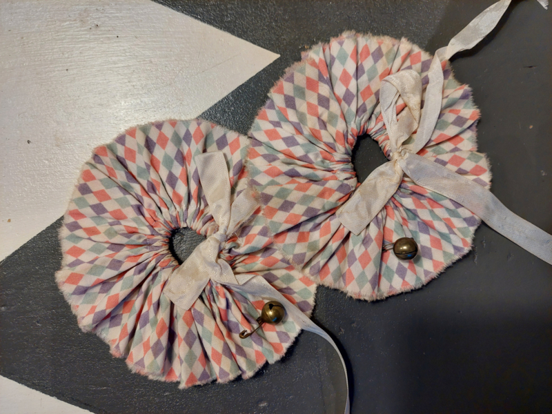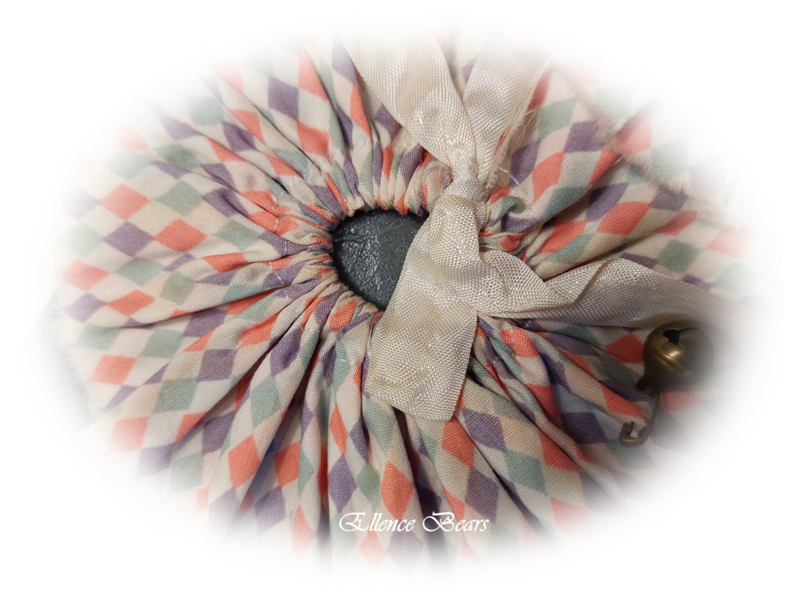 Kleur: ecru / lila / zalm / groen harlekijn ruitje. (door de koffie geverfd)