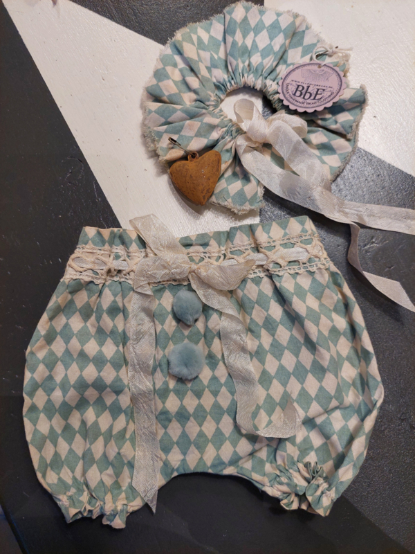 OverzichtMintgroen pompom broekje met bijpassend kraagje in een harlekijnruitje