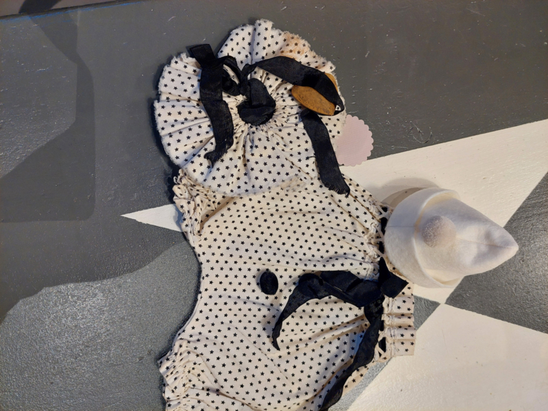 OverzichtPompom broekje met bijpassend kraagje gemaakt uit een wit met zwarte kleine sterretjes stof.