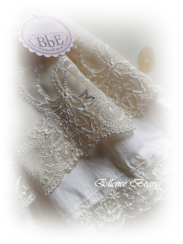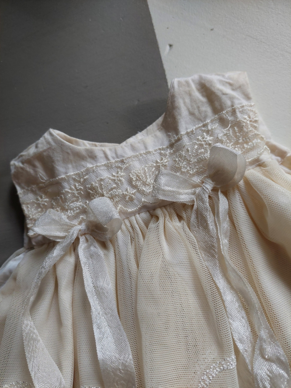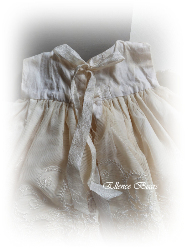 Het jurkje is gemaakt uit meerdere lagen ecrukleurige stof en afgewerkt metdiverse mooie kantjes. Het sluit aan de achterzijde met 2 strikken van ecrukleurig kreukellint.