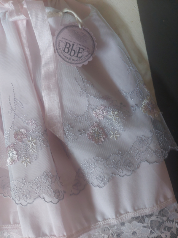 OverzichtSchattigexclusief handgemaakt jurkje in rose met zacht zeegroen Passend voor beer Klaartje of een andere beer van ongeveer 45cm groot.