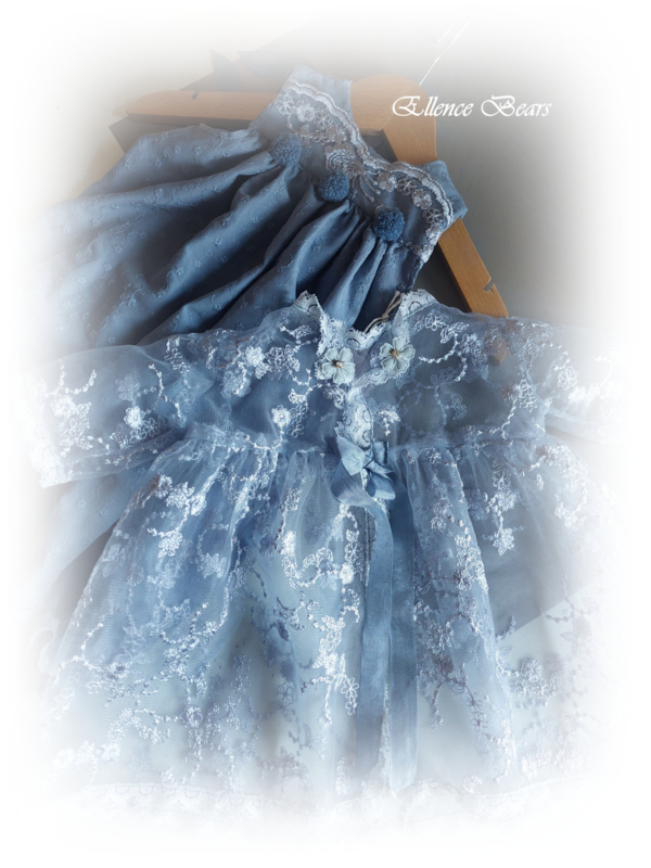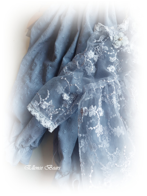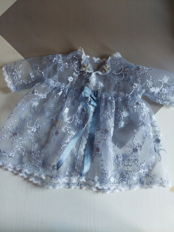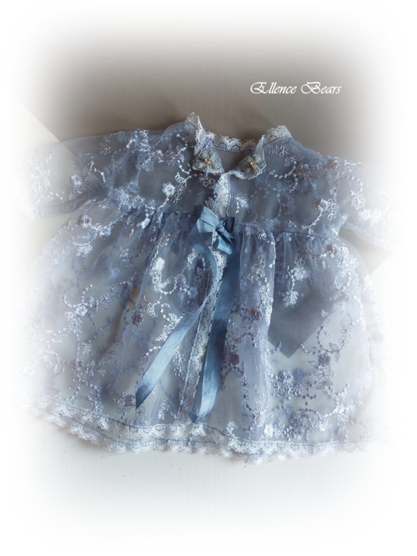 Het overjurkje is gemaakt uit een prachtige oud blauwe kant en afgebiesd met een smal kantje. Het sluit aan de voorzijde met 2 strikken kreukellint.