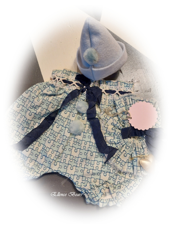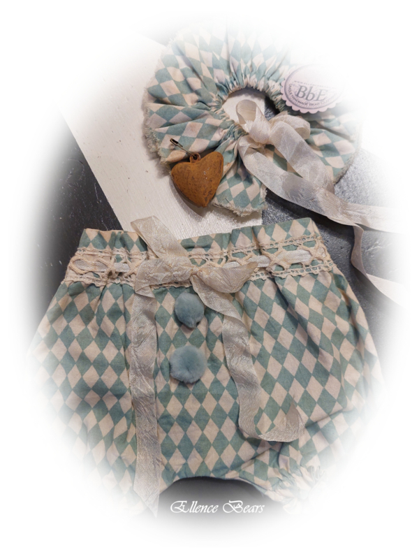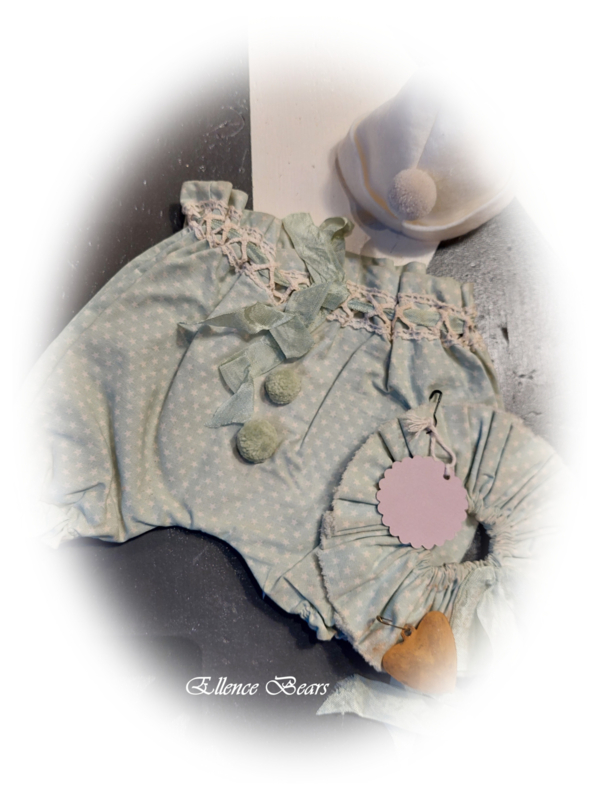 POMPOM BROEKJE MET KRAAGJESetje bestaande uit een ballonbroekje met bijpassend kraagje uit een leuk oudblauwe stof met beige noppen.