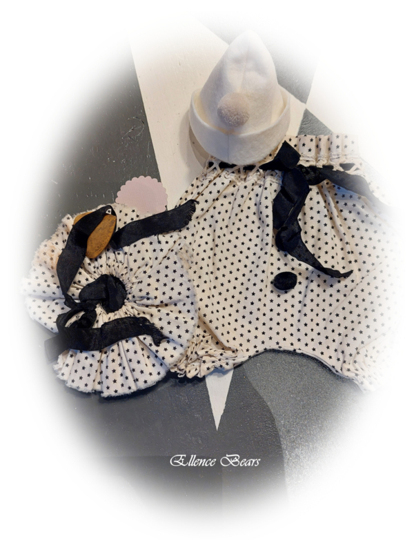 POMPOM BROEKJE MET KRAAGJEPompom broekje met bijpassend kraagje gemaakt uit een wit met zwarte kleine sterretjes stof.